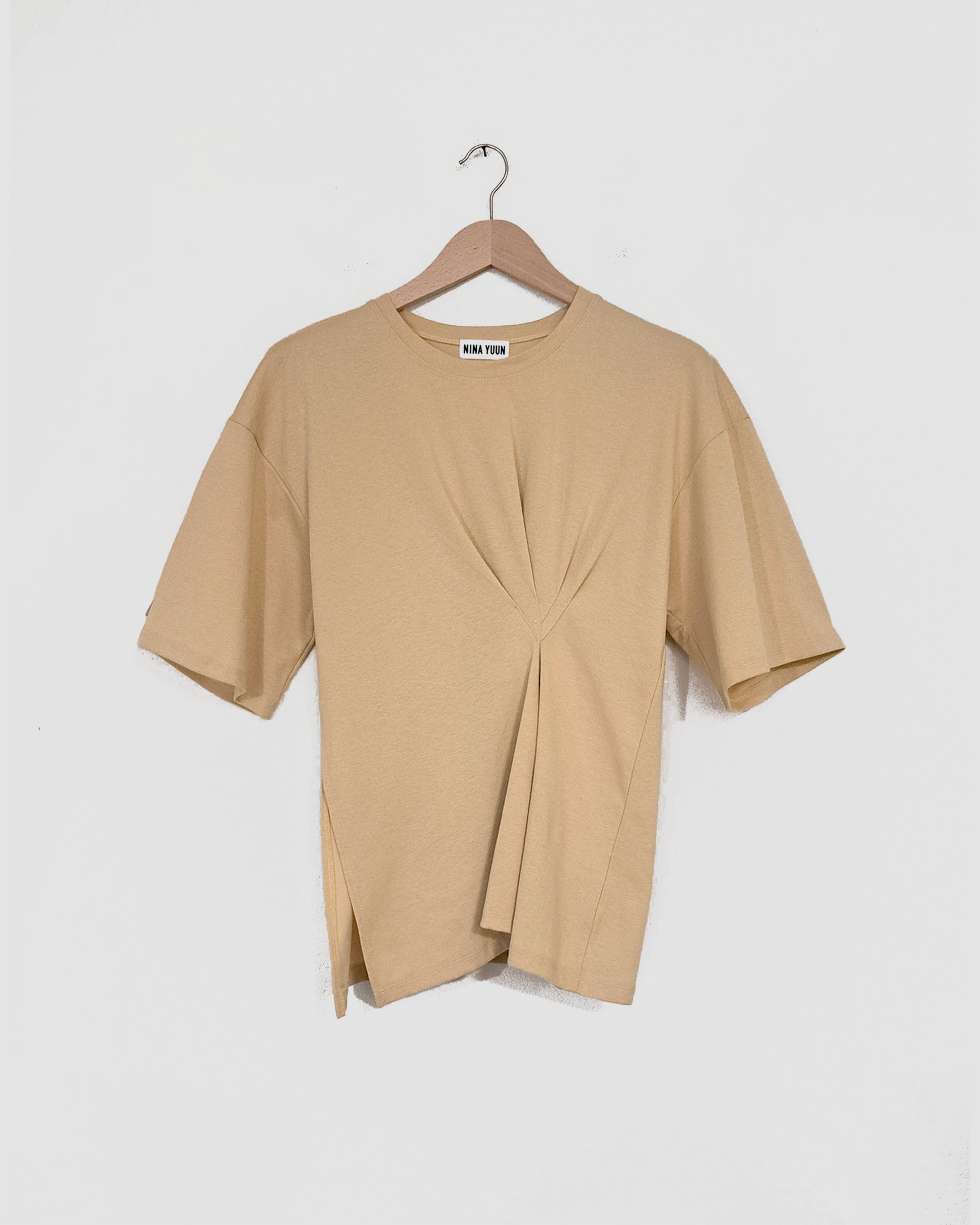 T-Shirt mit skulpturalen Falten und einem langen Seitenschlitz • minimalistisch und dennoch dynamisch für den Alltag.
