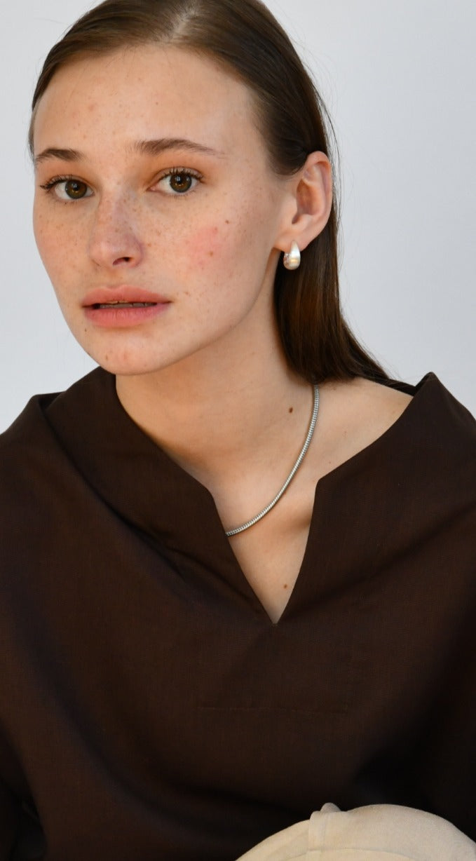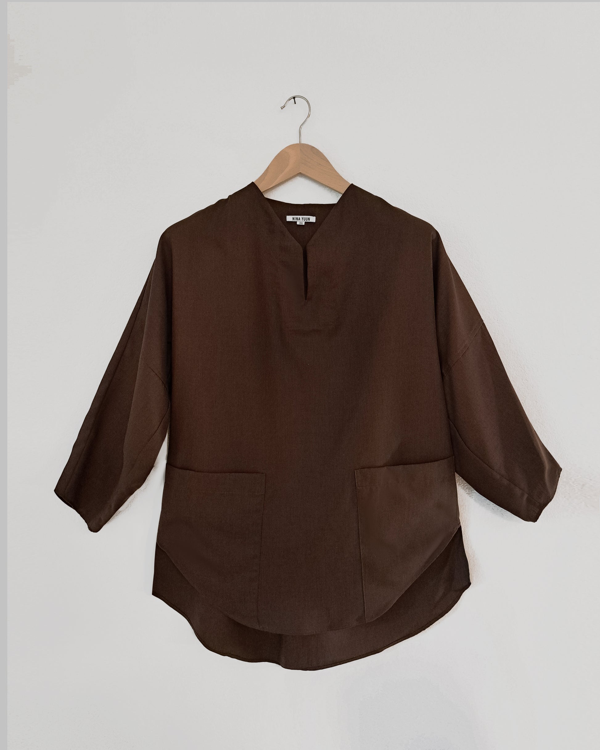 A slightly oversized shirt featuring meticulously 3D-draped sleeves and a sculpted body silhouette, complete with pockets, side slits, and a longer back.