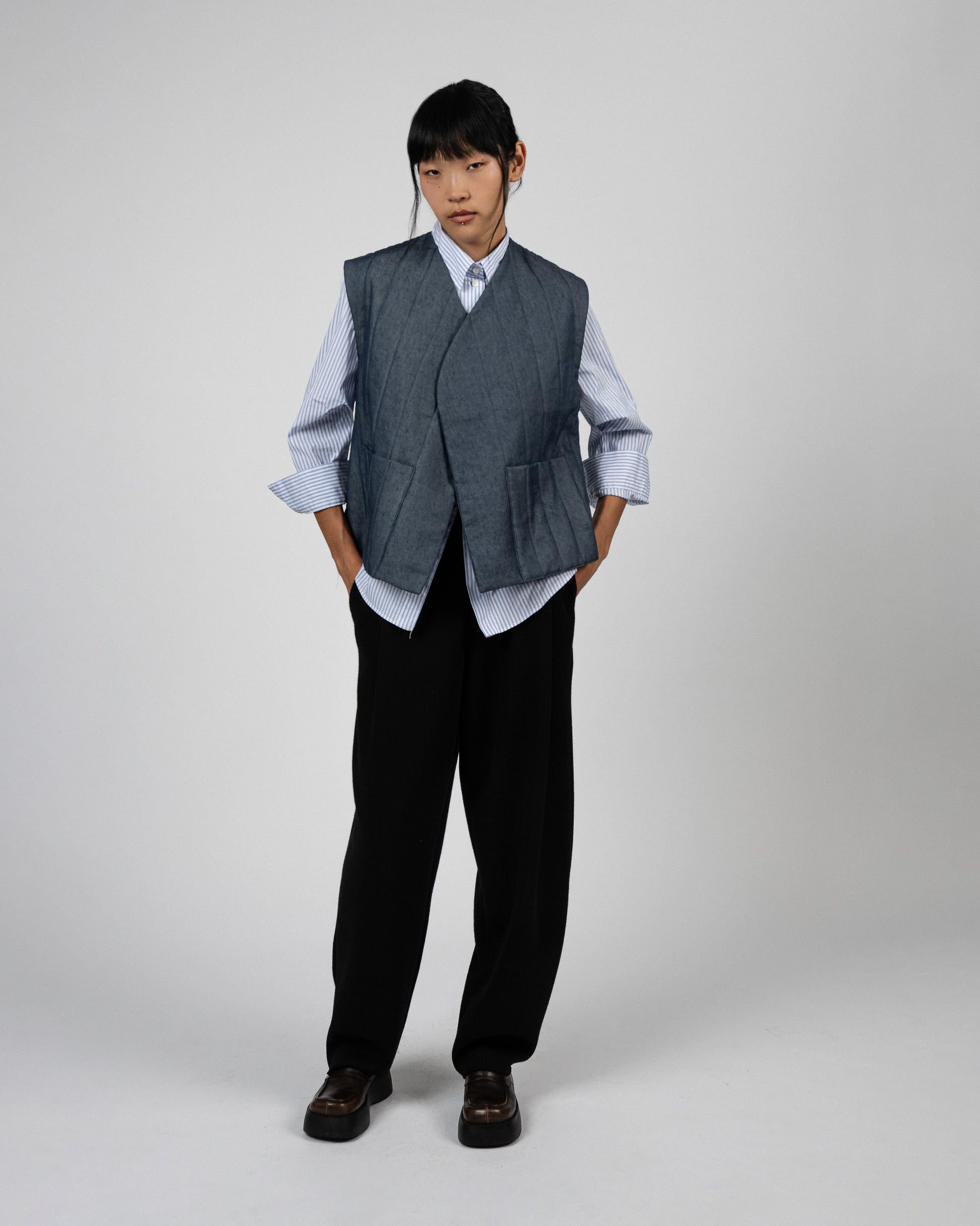 A casual variation of our beloved Nubi Vest in “air denim,” light indigo color.