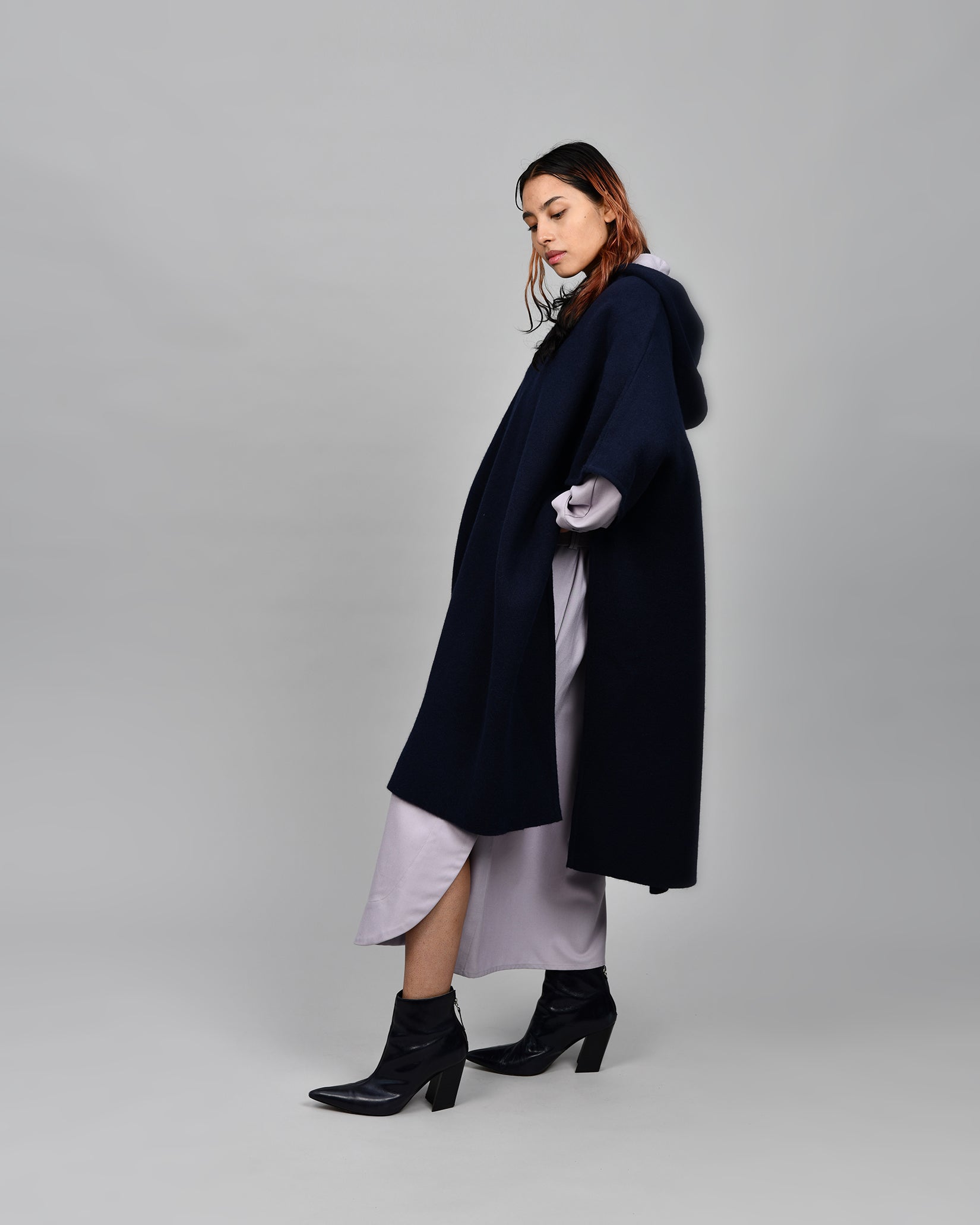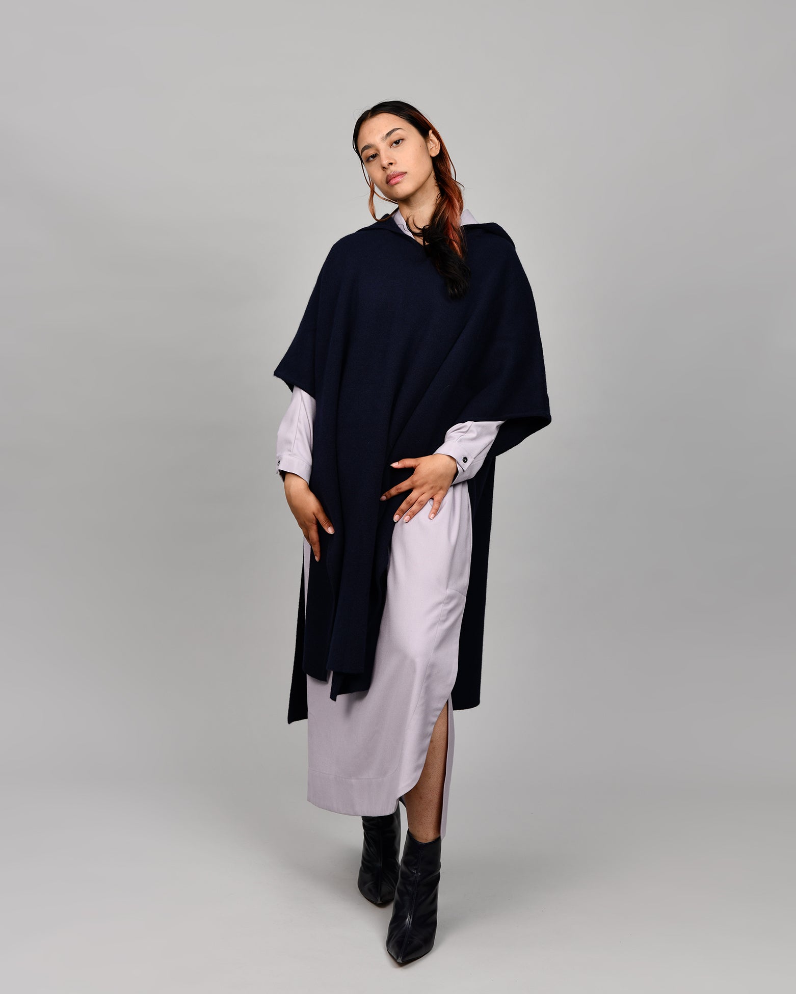 A wide-cut knit cape with open side slits, offering both comfort and style. The added hoodie provides warmth, perfect for layering in cooler weather.
