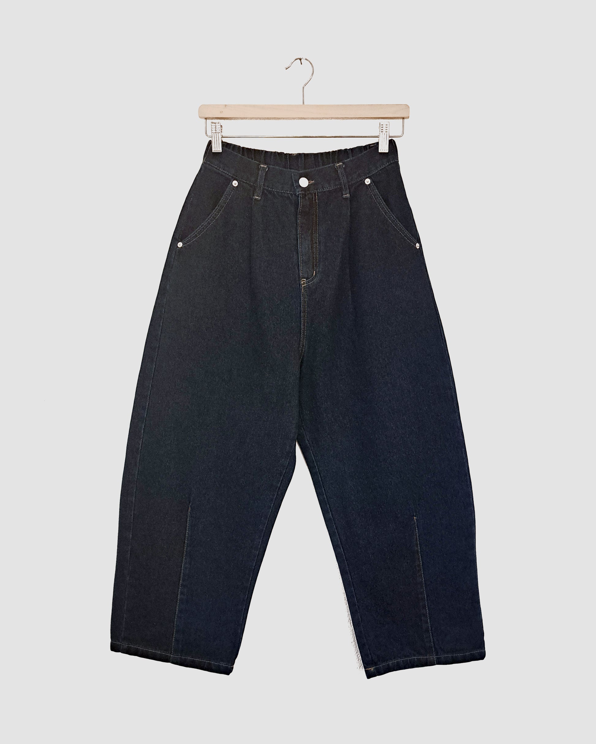 Sophisticated and durable jeans with a slight avant-garde touch, thanks to their voluminous silhouette. Featuring stitch details on the bottom hem and waistline. Designed for a comfortable fit across four sizes (34–40). A unisex piece.